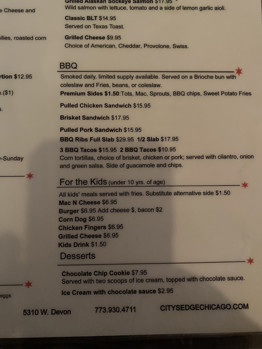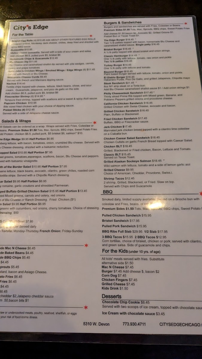Welcome to City's Edge, located at 5310 W Devon Ave, Chicago. This vibrant eatery seamlessly combines a welcoming pub atmosphere with an impressive menu that caters to all tastes. The salad selections are fresh and diverse, featuring options like the flavorful Chopped Buffalo Chicken and a delightful Garden Salad, perfect for health-conscious diners.